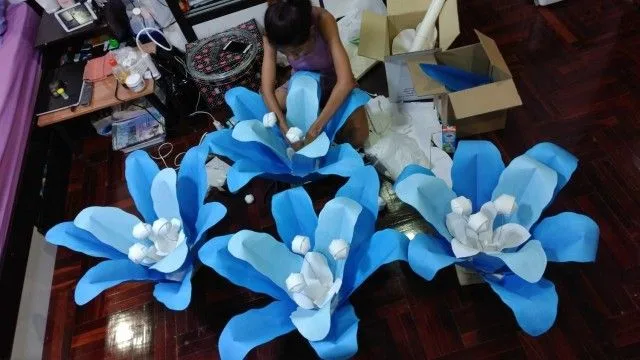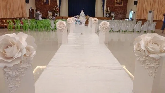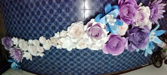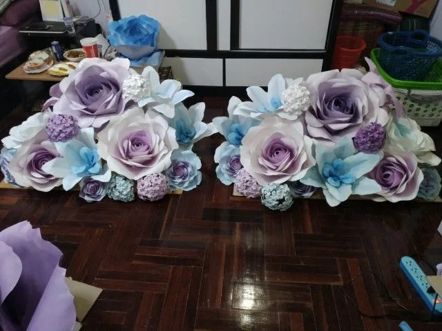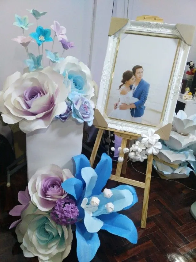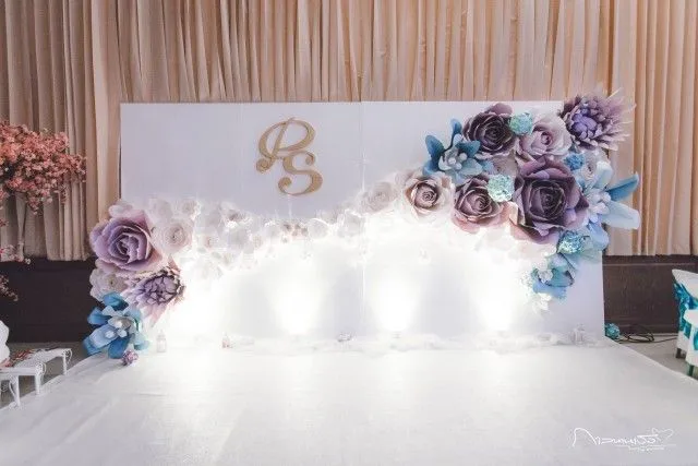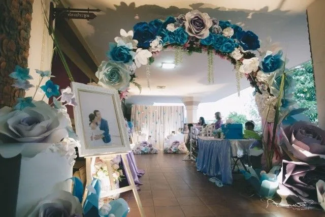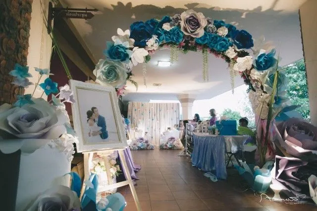 โจทย์ของคู่เราคือ 1)สถานที่จัดงานต้องใกล้บ้าน 2)ประหยัดค่าใช้จ่ายส่วนที่สามารถประหยัดได้ จึงเลือกที่จะให้หอประชุมโรงเรียนใกล้บ้านจัดงานทั้งเช้าและเย็นโดยส่วนตัวเป็นคนไม่ชอบงานผ้า เลยคิดหาอะไรที่สามารถเตรียมไว้ล่วงหน้าเป็นเวลานานๆได้พอหาข้อมูลงานแต่งงานของคู่ผ่านๆมาก็สนใจงานดอกไม้กระดาษ เมื่อสอบถามราคากับร้านที่รับจ้างทำแบรคดรอปดอกไม้กระดาษก็สู้ราคาไม่ไหวจริง ความคิดที่จะทำเองก็บรรเจิดเกิดขึ้น ทั้งที่ไม่เคยทำมาก่อน เราใช้เวลาหลังจากเลิกงานประจำ วันละ3-4ชม.ทำไปที่ละดอก2ดอกแล้วแต่กำลังเริ่มจากการทดลองขนาดเล็กๆก่อนนั้นก็คือดอกไฮเดรนเยีย