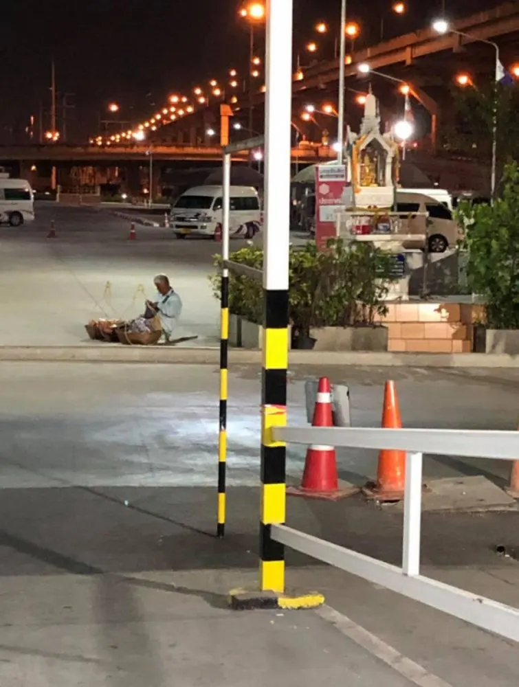 ตอนแรกที่เห็นคือคุณยายนั่งอยู่หน้าศาลพระภูมิวินรถตู้ข้างเมเจอร์รังสิต นั่งคนเดียวอย่างในรูป กวักมือเรียกคนที่เดินผ่านไปมาแต่ก็ไม่มีใครสนใจเลยสักคน เลยเดินเข้าไปหาคุณยาย