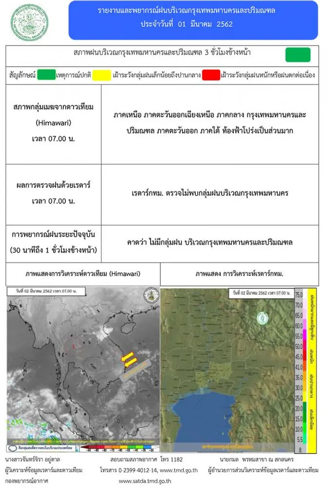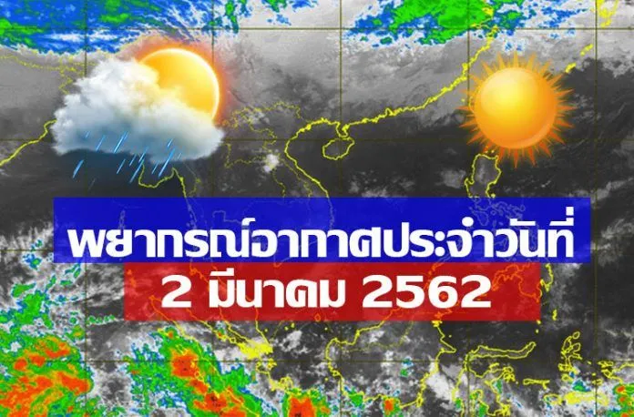 วันที่ 2 มี.ค.62 พยากรณ์อากาศ 24 ชั่วโมงข้างหน้า ประเทศไทยตอนบนมีอากาศร้อนโดยทั่วไป โดยมีฝนฟ้าคะนองบางแห่งบริเวณภาคเหนือตอนล่าง ภาคตะวันออกเฉียงเหนือ ภาคกลาง และภาคตะวันออก ขอให้ประชาชนบริเวณประเทศไทยตอนบนดูแลสุขภาพเนื่องจากสภาพอากาศที่ร้อนขึ้นในตอนกลางวันไว้ด้วย