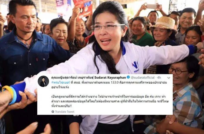 ทั้งนี้ล่าสุดคุณหญิงสุดารัตน์ เกยุราพันธุ์ ประธายุทธศาสตร์การเลือกตั้งพรรคเพื่อไทย และแคนดิเดตนายกรัฐมนตรีของพรรค ได้ทวิตข้อความแสดงความคิดเห็นเกี่ยวกับ พ.ร.บ.การรักษาความมั่นคงปลอดภัยไซเบอร์ ในทวิตเตอร์ @sudaratofficial ว่า พ.ร.บ.ไซเบอร์ ที่ สนช. พึ่งผ่านมาด้วยคะแนน 133:0 คือการคุกคามเสรีภาพของประชาชนอย่างโจ่งแจ้ง