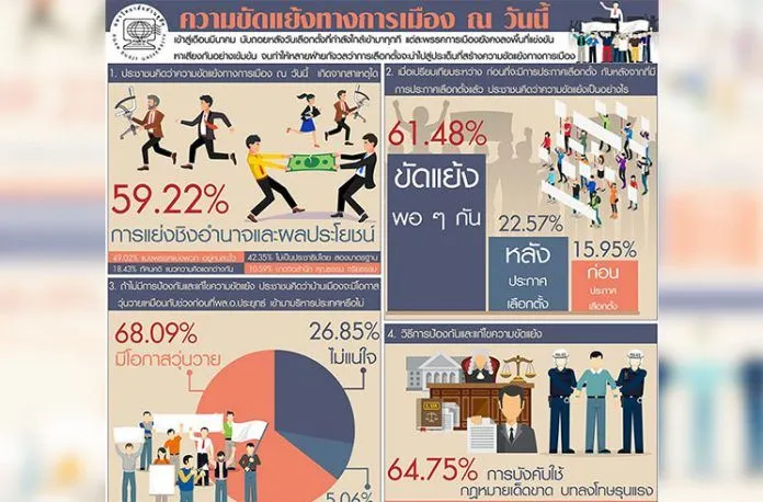 โดยผลสำรวจพบว่า ร้อยละ 59.22 ประชาชนมอบขัดแย่งเรื่องการแย่งชิงอำนาจและผลประโยชน์ รองลงมา ร้อยละ 49.02 การแบ่งพรรคแบ่งพวก อยู่คนละขั้ว และอันดับ 3 ร้อยละ 42.35 ไม่เป็นประชาธิปไตย สองมาตรฐาน ขณะเดียวกัน ประชาชนถึงร้อยละ 68.09 มองว่า บ้านเมืองมีโอกาสวุ่นวายเหมือนกับช่วงก่อนที่ พล.อ.ประยุทธ์ จันทร์โอชา เข้ามาบริหารบ้านเมือง เพราะอาจเกิดความขัดแย้ง มีความเคลื่อนไหว ชุมนุม เรียกร้อง การเลือกตั้งร้อนแรง คนไม่เคารพกฎกติกา ส่วนร้อยละ 26.85 ประชาชนไม่แน่ใจ เพราะมีทั้งกลุ่มสนับสนุนและต่อต้าน ขึ้นอยู่กับการบริหารจัดการของนายรัฐมนตรี อาจมีมือที่สามเข้ามาแทรกแซง