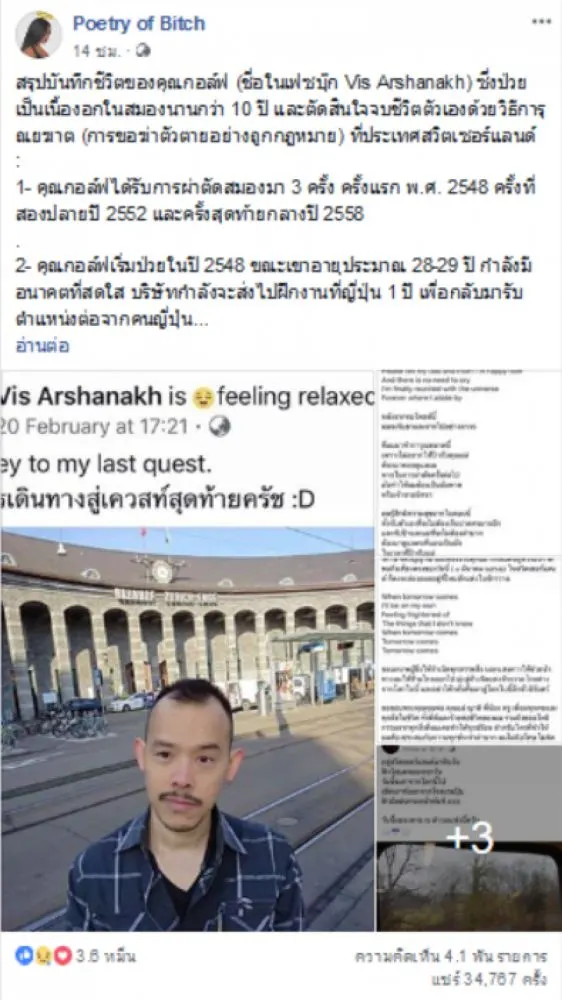 ในเฟสบุ๊ก Poetry of Bitch โพสต์ข้อความระบุว่า สรุปบันทึกชีวิตของคุณกอล์ฟ (ชื่อในเฟซบุ๊ก Vis Arshanakh) ซึ่งป่วยเป็นเนื้องอกในสมองนานกว่า 10 ปี และตัดสินใจจบชีวิตตัวเองด้วยวิธีการุณยฆาต (การขอฆ่าตัวตายอย่างถูกกฎหมาย) ที่ประเทศสวิตเซอร์แลนด์