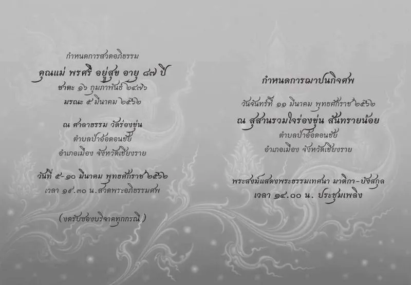 อาลัยรักยิ่ง แม่พรศรี คุณแม่ของ อาจารย์เฉลิมชัย สิ้นลมแล้ว ตั้งบำเพ็ญกุศล ณ วัดร่องขุ่น พร้อมเผยกำหนดการพิธี