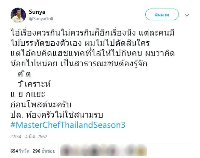 เรียกได้ว่าเป็นอีกหนึ่งกระแสโซเชียลที่กำลังเป็นที่วิพากวิจารณ์อยู่มากในขณะนี้ หลังรายการ Master Chef Thailand นำปลากระเบนมาเป็นวัตถุดิบหลัก ในการทำอาหาร เพื่อหาผู้ชนะเพราะหลังจากที่มีภาพออกไปหลายคนก็เกิดความไม่พอใจ และมองว่าเอาปลากระเบนมาทำแบบนี้ดีแล้วหรอ หนึ่งในนั้นก็มีนักแสดงหนุ่ม ปั้นจั่น ประมะ ที่ได้ออกมาโพสต์ดราม่าเรื่องนี้ด้วยพร้อมกับติดแฮชแท็คว่า #อยากแปลกไม่แดกคนละครับ ล่าสุดนี้ พิธีกรสาวอย่าง ป๊อก ปิยธิดา ได้เข้าไปคอมเม้นท์ในทวิตเตอร์หลังจากที่ผู้เข้าแข่งขัน นุ่มกอล์ฟ มาสเตอร์เชฟซีซั่น 2 ก็เลยออกมาทวิตข้อความว่าไอ้เรื่องควรกินไม่ควรกินก็อีกเรื่องนึง แต่ละคนมีไม้บรรทัดของตัวเอง ผมไม่ไปตัดสินใคร แต่ไอ้คนคิดแฮชแทคที่ไล่ให้ไปกินคน ผมว่าคิดน้อยไปหน่อย เป็นสาธารณะชนต้องรู้จักค ิด ว ิเคราะห์ แ ย กแยะ ก่อนโพสต์นะครับ ปล. ห้องครัวไม่ใช่สนามรบ #MasterChefThailandSeason3 ทำเอาสาวป๊อก เข้ามาคอมเม้นท์ถึงเรื่องไล่ให้ไปกินคนด้วยว่า เคยพยายามลองกินแล้วนะคะ แต่เค้าวิ่งหนีตลอดเลย พี่เลยล้มเลิกความตั้งใจ..