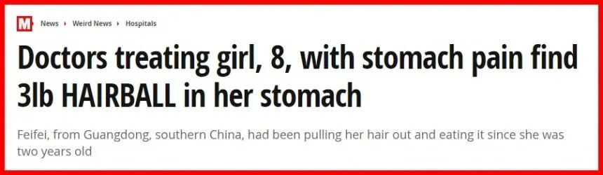 เด็กหญิงเฟ่ยเฟ่ยวัย 8 ขวบจากมณฑลกวางตุ้งของจีน มีพฤติกรรมสุดประหลาดที่แม่ของเธอยังหาคำอธิบายไม่ได้ โดยเธอชอบดึงปอยผมตัวเองมาเคี้ยวหยับๆเข้าปากอยู่เป็นประจำตั้งเธออายุได้ 2 ขวบ เฟ่ยเฟ่ยทำแบบนี้ทุกวันเป็นประจำจนแม่ของเธอหมดสิ้นทางแก้จึงปล่อยเลยตามเลย แต่มีเตือนอยู่ครั้งคราว พอมาปี 2019 เฟ่ยเฟ่ย ก็ได้บอกแม่ว่าตนเลิกกินผมตัวเองแล้ว หลังจากนั้นเธอก็ดำเนินชีวิตตามปกติเรื่อยมา