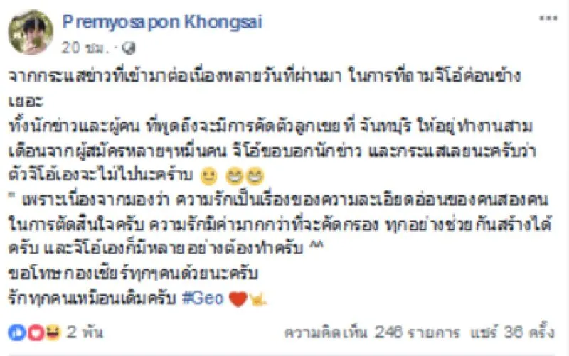 ล่าสุดในเฟซบุ๊ก Premyosapon Khongsai ของหนุ่มจีโอ้ ได้โพสต์ข้อความระบุว่า
