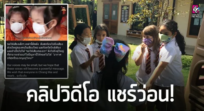 แชร์ว่อน!โรงเรียนเชียงใหม่ทำคลิปวิดีโอเด็กนักเรียนสวมหน้ากากอนามัย วิงวอนแก้ปัญหาหมอกควันและฝุ่นละอองขนาดเล็ก หลังเผชิญค่ามลพิษอากาศสูงเกินมาตรฐานต่อเนื่อง จนต้องงดทำกิจกรรมกลางแจ้ง