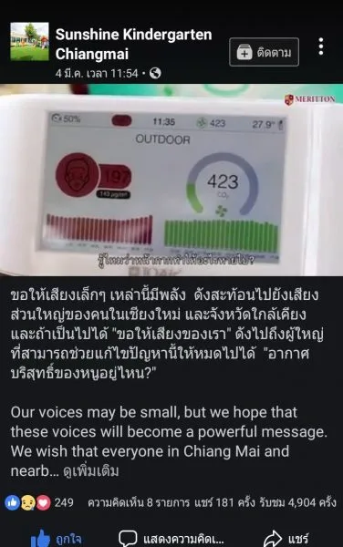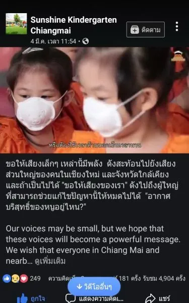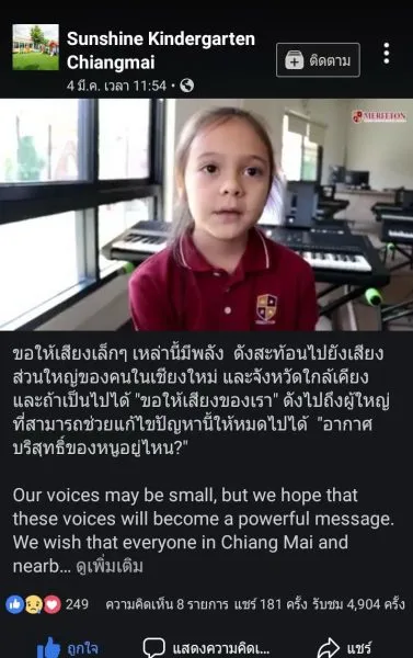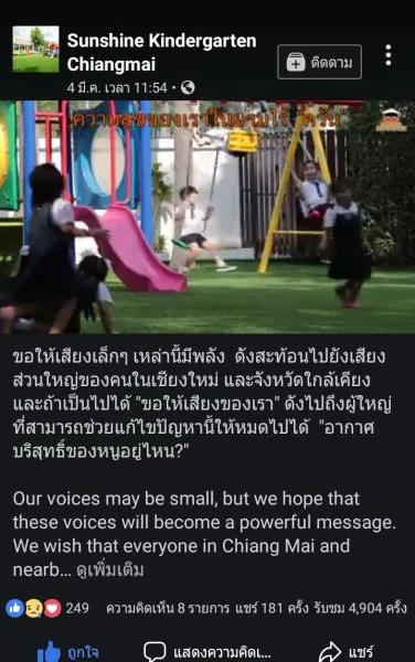 รายงานจากจังหวัดเชียงใหม่แจ้งว่า จากสถานการณ์ปัญหาหมอกควันและค่าฝุ่นละอองขนาดเล็กสูงเกินค่ามาตรฐานในพื้นที่จังหวัดเชียงใหม่และหลายจังหวัดภาคเหนือตอนบน จนมีผลกระทบต่อสุขภาพต่อประชาชน โดยเฉพาะอย่างยิ่งกลุ่มเสี่ยงทั้งเด็ก คนชรา และผู้ป่วยโรคเรื้อรัง เมื่อวันที่ 4 มี.ค.62 เพจเฟซบุ๊คชื่อ “Sunshine Kindergarten Chiangmai” ทำการโพสต์เผยแพร่คลิปวิดีโอที่กลุ่มโรงเรียนนานาชาติในจังหวัดเชียงใหม่ร่วมกับจัดทำขึ้น