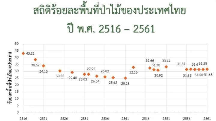 ทัังนี้หากเทียบตั้งแต่ปี 2516- 2561 ป่าไม้ไทยในปี 2516 เคยมีถึงร้อยละ 43.21 และเริ่มลดลงอย่างต่อเนื่องในช่วงสัมปทานป่าปี 2531 ป่าไม้เหลือร้อยละ 28.03 ปี 2541 ร้อยละ 25.28 และแม้จะมีตัวเลขเพิ่มขึ้นในปี 2551 เป็นร้อยละ33.44 แต่ระหว่างปี 2556 เริ่มลดลงร้อยละ 31.62 ปี 2559ร้อยละ 31.58 และปี 2561 เพิ่มเป็นร้อยละ 31.68