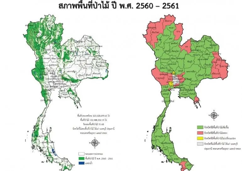 “สรุปข้อมูลสภาพพื้นที่ป่าไม้พ.ศ.2560–2561 มีจำนวน 102,488,302.19 ไร่ หรือร้อยละไม้ 31.68 หนึ่งปีผ่านมา ระหว่าง 2560–2561 พื้นที่ป่าไม้ของประเทศไทยเพิ่มขึ้น 331,951.67 ไร่ พื้นที่ป่าไม้ที่ไม่มีการเปลี่ยนแปลง 101,178,945.22 ไร่”
