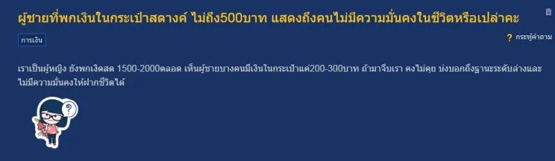 เรียกว่ากำลังเป็นเรื่องดุเดือดเป็นอย่างมากสำหรับการตั้งกระทู้ในเว็บไซต์ pantip ของหญิงสาวรายหนึ่ง ที่มีการตั้งหัวข้อเอาไว้ว่า ผู้ชายที่พกเงินในกระเป๋าสตางค์ ไม่ถึง500บาท แสดงถึงคนไม่มีความมั่นคงในชีวิตหรือเปล่าคะ จนทำให้โลกโซเชียลนั้นต้องเข้ามาแสดงความคิดเห็นกันอย่างมากมาย