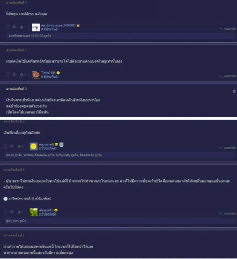 โดยเธอนั้นได้ระบุข้อความว่า เราเป็นผู้หญิง ยังพกเงิดสด 1500-2000ตลอด เห็นผู้ชายบางคนมีเงินในกระเป๋าแค่200-300บาท ถ้ามาจีบเรา คงไม่คุย บ่งบอกถึงฐานะระดับล่างและไม่มีความมั่นคงให้ฝากชีวิตได้