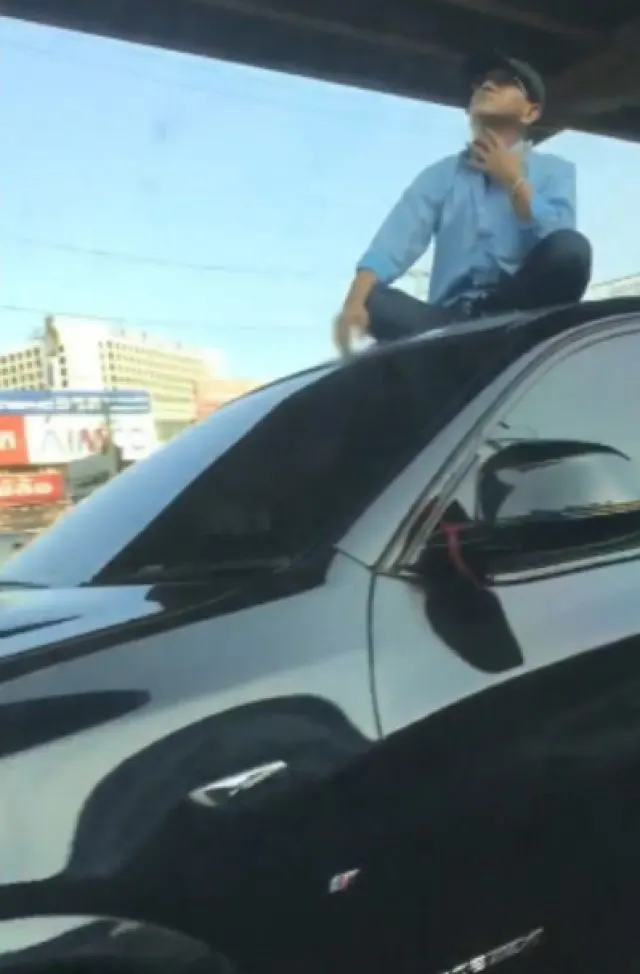 จากกรณีโลกออนไลน์มีการแชร์คลิปเหตุการณ์ที่มีชายคนหนึ่งสวมเสื้อสีฟ้านั่งสูบบุหรี่อยู่บนหลังคารถ BMW ป้ายแดงกลางถนน ซึ่งเป็นช่องทางด่วนบริเวณย่านรังสิต โดยผู้โพสต์คลิประบุเพียงว่า "ข้างๆ มีอุบัติเหตุ แต่ไม่รู้ว่าชายคนดังกล่าวเป็นอะไร" จนสร้างความแปลกใจและวิพากษ์วิจารณ์ถึงความไม่เหมาะสม