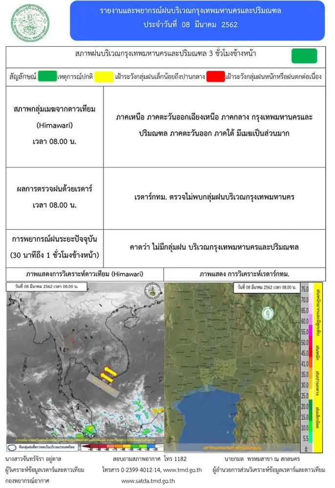 วันที่ 8 มี.ค.62 พยากรณ์อากาศ 24 ชั่วโมงข้างหน้า ประเทศไทยตอนบนมีอากาศร้อนในตอนกลางวัน โดยมีฝนฟ้าคะนองบางแห่งบริเวณภาคตะวันออก และภาคตะวันออกเฉียงเหนือตอนล่าง ขอให้ประชาชนบริเวณประเทศไทยตอนบนดูแลสุขภาพเนื่องจากสภาพอากาศร้อนในตอนกลางวันไว้ด้วย