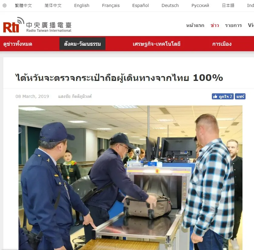 เวบไซต์ จุลสารอาร์ทีไอ ภาคภาษาไทย ของสถานีวิทยุ Rit ประเทศไต้หวัน รายงานข่าวว่าไต้หวันจะตรวจกระเป๋าถือผู้เดินทางจากไทย 100% และตรวจกระเป๋าชาวไทยอย่างเข้มข้น การเข้าแดนจะเหมือนกับออสเตรเลีย ของทุกอย่างจะต้องผ่านการตรวจ ป้องกันการขนพืชและสัตว์ที่อาจเป็นพาหะของโรคระบาด