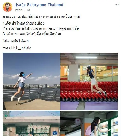 กำลังเป็นเทรนด์การถ่ายรูปที่กำลังมาแรงในเกาหลี ที่ถ่ายออกมาแล้วจะเหมือนกับว่าเรานั้นลอยได้ จะพาไปดูภาพตัวอย่าง และวิธีการถ่ายง่ายๆ ที่ใครๆ ก็สามารถทำได้ โดยจากเพจ ผู้หญิง Salaryman Thailand ได้เผยวิธีโดยระบุว่า...