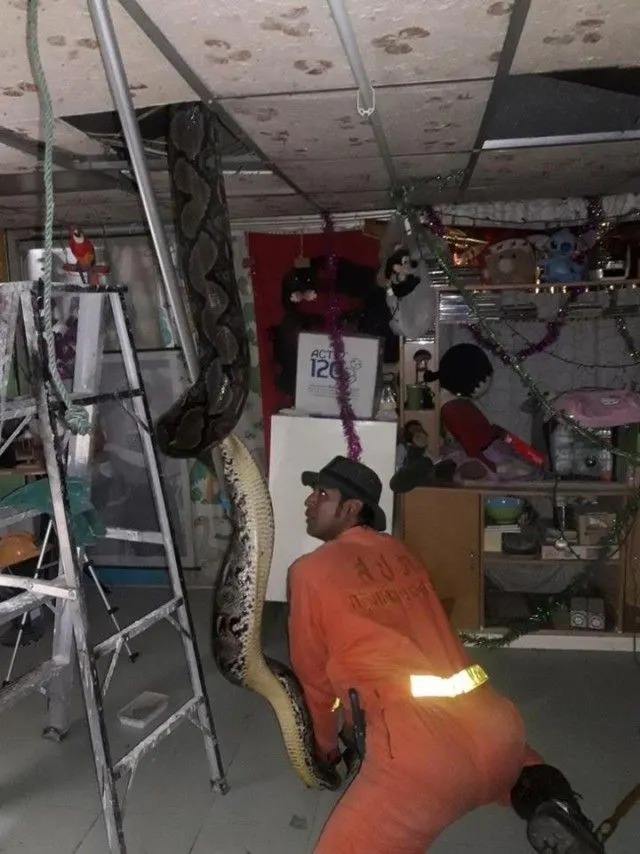 จากกรณีเจ้าหน้าที่รับแจ้งเหตุพบงูเหลือมขนาดใหญ่ เข้าบ้านเรือนประชาชน ในซอยลาซาล 50 เขตบางนา กรุงเทพมหานคร เจ้าหน้าที่ดับเพลิงบางนารุดเข้าตรวจสอบ พบว่างูเลื้อยเข้าไปอาศัยอยู่บนเพดานบ้าน ขดตัวพันอยู่กับโครงหลังคา จึงจำเป็นต้องรื้อฝ้าเพดานออก แล้วมุดตัวเข้าไปทำการจับงูตัวดังกล่าวซึ่งมีขนาดใหญ่มาก