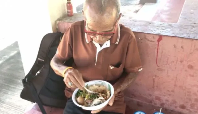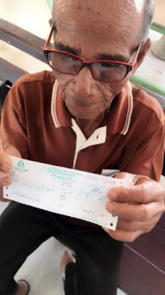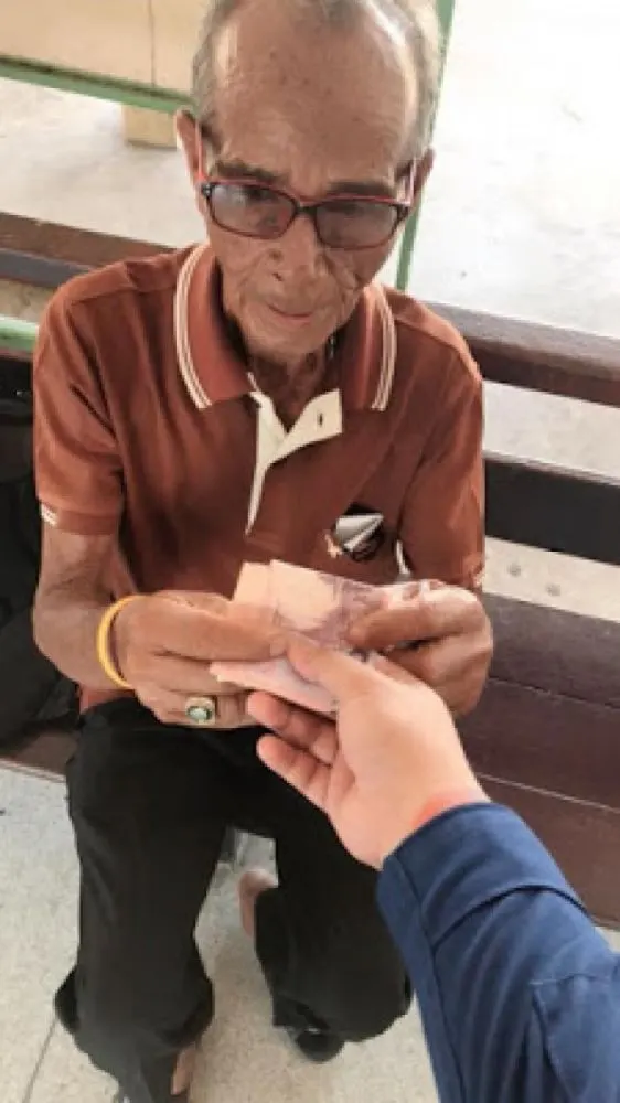 วันนี้ผมนั่งกินข้าวอยู่มีคุณลุงเดินหิ้วกระเป๋ามาบอกว่า หนูๆลุงขอข้าวกินหน่อยได้ไม๊? ผมจึงเอาข้าวให้ลุงกินจนอิ่มและสอบถามลุงว่า ลุงจะไปไหนครับ ลุงบอกว่าลุงชื่อ ประพันธ์ อายุ 80 แล้ว ลุงมาจากจังหวัดชุมพร ตั้งแต่วันที่ 29 ที่ผ่านมา เพื่อมาตามหาลูกสาวที่ครั้งสุดท้ายก่อนจากกันกับลูก ลุงรู้แค่ว่ามาทำงานที่กาญจนบุรีเท่านั้น ลุงบอกไม่มีเงินติดตัวแล้วเพราะมาจากชุมพร มีเงินแค่ 300 บาท เป็นเงินที่ลุงเก็บพริกในสวนบ้านลุงขายและออกตามหาลูกสาว ส่วนเมียของลุงไม่อยู่มา 6-7 ปีแล้ว ซึ่งคุณลุงอยู่เพียงลำพังตัวคนเดียว สุดท้ายลุงบอกเดินตามหาไม่เจอจนลุงท้อไปทุกทางเลยกลับบ้าน คุณลุงขาด้านซ้ายเคยโดนชนเดินไม่ค่อยดีเท่าไหร่นัก ผมได้ยินเรื่องราวแล้วน้ำตาตกเลยเพื่อนๆ ผมกับเพื่อนและพี่ก็ช่วยกันรวมเงิน ซึ่งอาจจะไม่มากแต่ก็คงพอให้คุณลุงถึงบ้านอย่างปลอดภัยครับ ผมกับเพื่อนเลยนำลุงขึ้นรถเพื่อไปส่งลุงที่สถานีรถไฟ อ.บ้านโป่ง เพื่อขึ้นรถไฟลงสายภาคใต้ ค่าใช้จ่ายทั้งหมดทางเราออกให้ทั้งหมดครับ