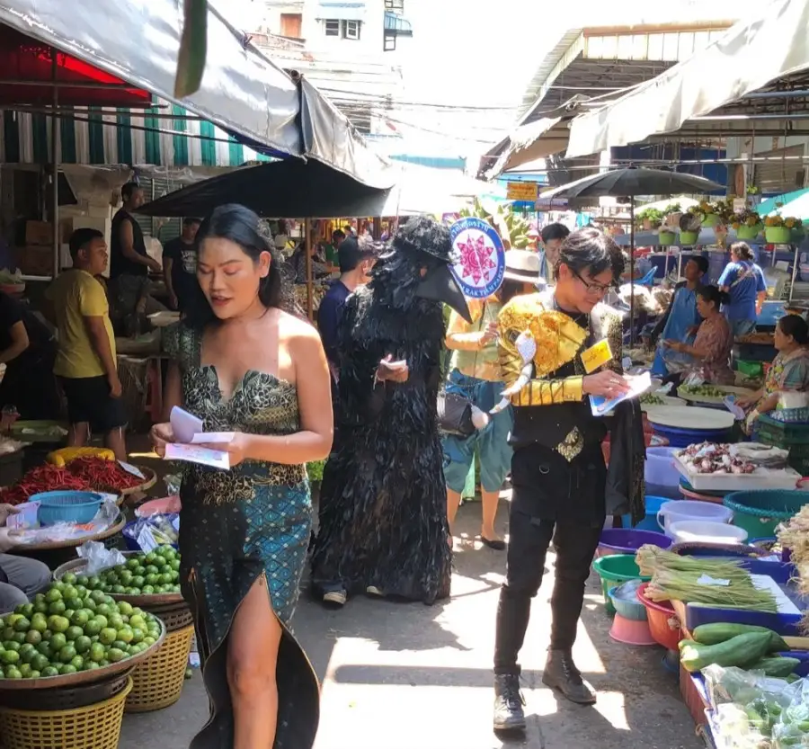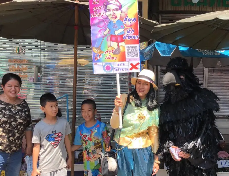 “พรรคไทรักธรรม” เดินเครื่องหาเสียงแบบตุ๊ดๆ จัดชุดอลังการ หน้ากากอีกาก็มา หน้ากากทุเรียนก็มี สร้างสีสันการเมืองแบบสนุกสนานเรียกรอยยิ้มและเสียงหัวเราะให้กับชาวตลาดมหาชัย จังหวัดสมุทรสาคร