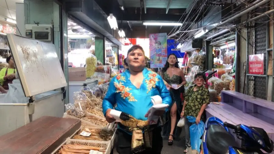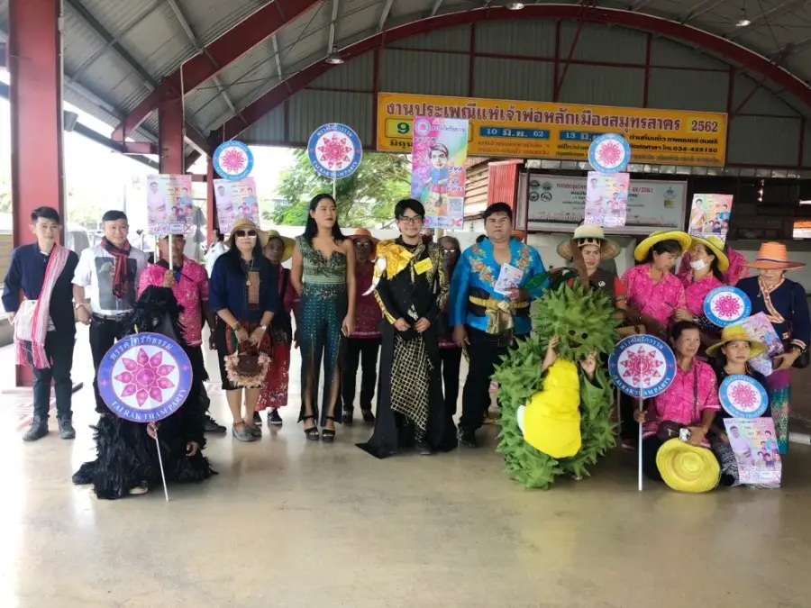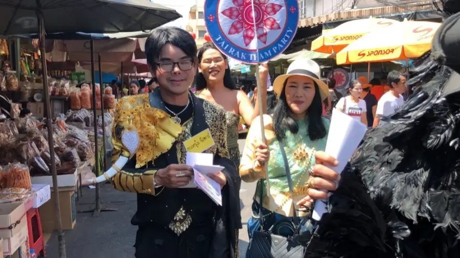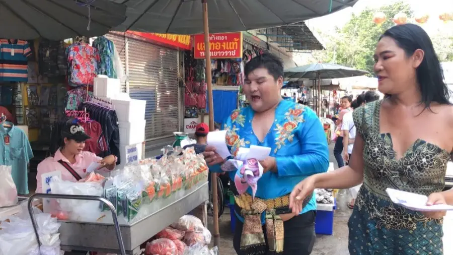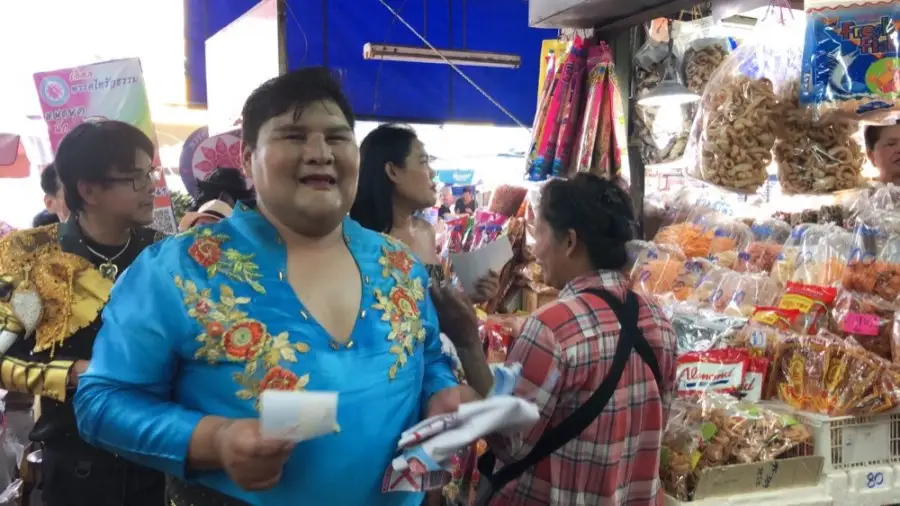 กะเทยครองตลาดมหาชัย “พรรคไทรักธรรม“ เดินหาเสียง หน้ากากอีกาดำ - ทุเรียนก็มา
