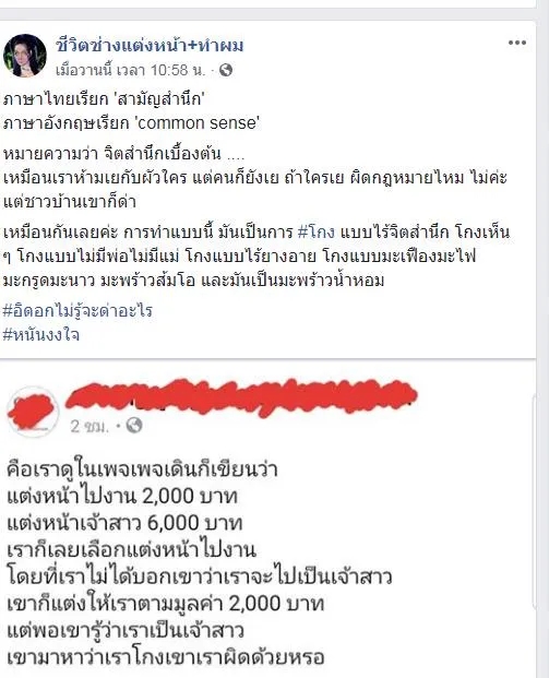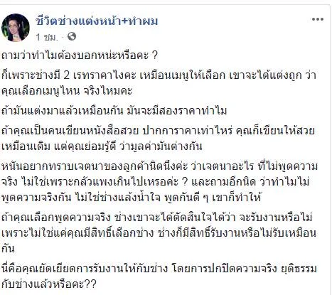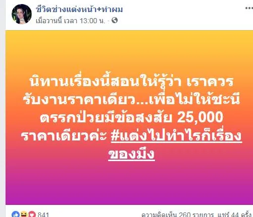 เมื่อวันที่ 10/3/2562 ทางเพจ ชีวิตช่างแต่งหน้า+ทำผม ได้โพสต์เรื่องราวของลูกค้ารายหนึ่งที่มาจ้างแต่งหน้า แต่ไม่บอกความจริง ทั้งที่ ต้องแต่งหน้าเป้นเจ้าสาว แต่มาบอกว่าแต่งหน้าไปงาน ตามข้อความด้านล่าง