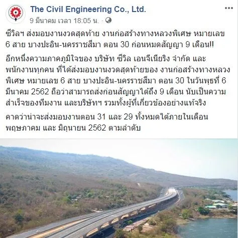 “ซีวิลฯ ส่งมอบงานงวดสุดท้าย งานก่อสร้างทางหลวงพิเศษ หมายเลข 6 สาย บางปะอิน-นครราชสีมา ตอน 30 ก่อนหมดสัญญา 9 เดือน อีกหนึ่งความภาคภูมิใจของ บริษัท ซีวิล เอนจีเนียริง จำกัด และพนักงานทุกคน ที่ได้ส่งมอบงานงวดสุดท้ายของ งานก่อสร้างทางหลวงพิเศษ หมายเลข 6 สาย บางปะอิน-นครราชสีมา ตอน 30 ในวันพุธที่ 6 มีนาคม 2562 ถือว่าสามารถส่งก่อนสัญญาได้ถึง 9 เดือน นับเป็นความสำเร็จของทีมงาน และบริษัทฯ รวมทั้งผู้ที่เกี่ยวข้องอย่างแท้จริง คาดว่าน่าจะส่งมอบงานตอน 31 และ 29 ทั้งหมดได้ภายในเดือน พฤษภาคม และ มิถุนายน 2562 ตามลำดับ”
