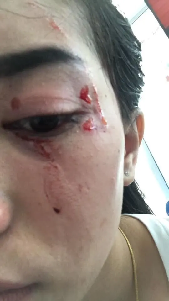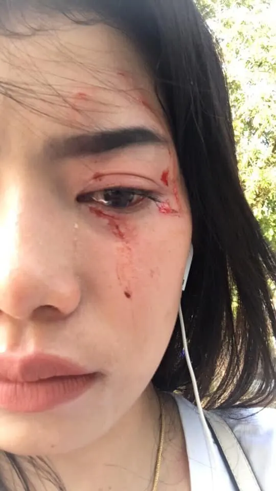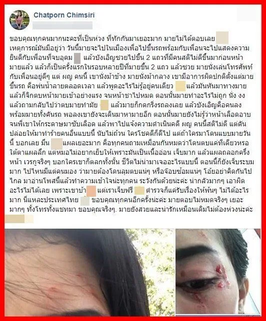 โดยหญิงสาวได้เล่าผ่านแอคเค้าท์ของเธอว่า "ขอบคุณทุกคนมากนะคะที่เป็นห่วง ที่ทักกันมาเยอะมาก มายไม่ได้ตอบเลย เหตุการณ์มันมีอยู่ว่า วันนี้มายจะไปในเมืองเพื่อไปขึ้นรถพร้อมกับเพื่อนจะไปแสดงความยินดีกับเพื่อนที่จบอุดม แล้วบังเอิญซวยไปขึ้น 2 แถวที่มีคนสติไม่ดีขึ้นมาก่อนหน้ามายแล้ว แล้วก็เป็นครั้งแรกในรอบหลายปีที่มายขึ้น 2 แถว แล้วซวย มายนั่งเล่นโทรศัพท์กับเพื่อนอยู่ดีๆ แต่ผู้หญิงคนนี้ เขานั่งม้าข้าง มายนั่งม้ากลาง เขามีอาการผิดปกติตั้งแต่มายขึ้นรถ คือพ่นน้ำลายตลอดเวลา แล้วพูดอะไรไม่รู้อยู่คนเดียว แล้วมันหันมาทางมาย แล้วก็จิกตบหน้ามายเข้าอย่างแรง จนหน้าชาไปหมด ตอนนั้นมายทำอะไรไม่ถูก นั่งงง แล้วถามกลับไปว่าตบมายทำมัย แล้วมายก็กดกริ่งรถลงเลย แล้วบังเอิญคือคนลงพร้อมมายทั้งคันรถ พอลงเขายังจะเดินมาหามายอีก ตอนนั้นมายยังไม่รู้ว่าหน้าเลือดอาบ จนพี่เขาให้กระดาษมาซับเลือด แล้วพาไปแจ้งความดำเนินคดี ผู้หญิงคนนี้สติไม่ดี แต่ดันปล่อยให้มาทำร้ายคนอื่นแบบนี้นับไม่ถ้วนใครโชคดีก็ดีไป แต่ถ้าใครมาโดนแบบมายวันนี้ บอกเลย มึน แผลเยอะมาก คือทุกคนถามเหมือนกันหมดว่าโดนตบแค่ทีเดียวหรอ ใต้ตาแผลลึก แต่หมอไม่อยากเย็บให้เพราะมันเป็นเนื้ออ่อน เจ็บมาก แล้วแผลถลอกครึ่งหน้า เวรกูจริง ๆ บอกใครเขาก็ตลกทั้งนั้น ชีวิตไม่น่ามาเจออะไรแบบนี้ ตอนนี้ก็ยังเจ็บระบมมาก ไปไหนมีแต่คนมอง ว่ามายต้องโดนลุมตบแน่ ๆ หรือจ๊อบซ้อมแน่ โอ้ย อย่าคิดกันไปไกล มาอ่านโพสนี้แล้วทำความเข้าใจน่ะทุกคน ระวังกันด้วยนะคะ น่ากลัวมาก ๆ เอาผิดอะไรไม่ได้เลย เพราะเขาบ้า แต่เราเจ็บฟรี ตำรวจก็แค่รับเรื่องให้พ้น ๆ ไม่ได้อะไรมาก นี่แหละประเทศไทย ขอบคุณทุกคนอีกครั้งนะคะ มายตอบไม่หมดจริง ๆ เยอะมาก ๆ ทั้งโทรทั้งแชทมา ขอบคุณจริง ๆ. มายยังสวยและน่ารักเหมือนเดิมไม่ต้องห่วงนะคะ"