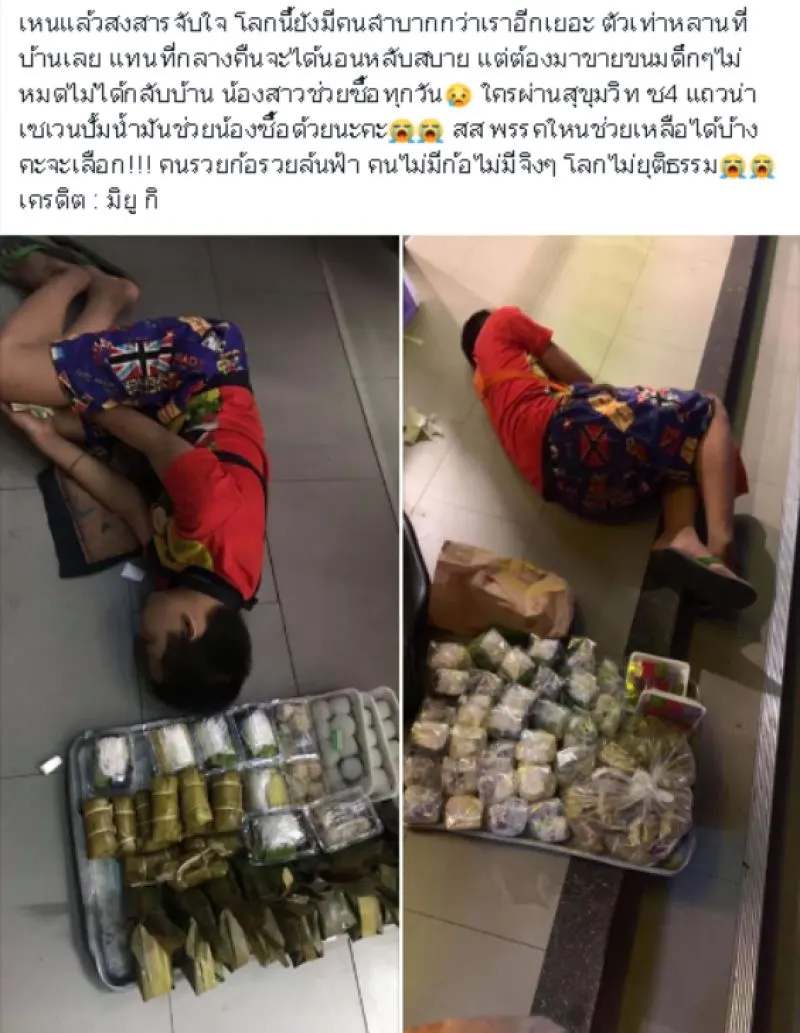 วันที่ 12 มีนาคม เพจผู้ใช้เฟซบุ๊กชื่อรายหนึ่ง ได้เผยแพร่เรื่องราวชวนน้ำตาไหล เมื่อเด็กน้อย คนหนึ่งต้องขายขนมจนหมด ง่วงก็ง่วง สุดสงสาร ครอบครัวสั่ง ถ้าขายไม่หมดก็ไม่ต้องกลับบ้าน เป็นภาพที่น่าสงสารมาก โดยได้ระบุข้อความว่า เห็นแล้วสงสารจับใจ โลกนี้ยังมีคนลำบากกว่าเราอีกเยอะ ตัวเท่าหลานที่บ้านเลย แทนที่กลางคืนจะได้นอนหลับสบาย แต่ต้องมาขายขนมดึกๆไม่หมดไม่ได้กลับบ้าน น้องสาวช่วยซื้อทุกวัน ใครผ่านสุขุมวิท ซ4 แถวน่าเซเว่นปั้มน้ำมัน ช่วยน้องซื้อด้วยนะคะ ส.ส. พรรคใหนช่วยเหลือได้บ้างคะจะเลือก!!! คนรวยก้อรวยล้นฟ้า คนไม่มีก้อไม่มีจริงๆ โลกไม่ยุติธรรม