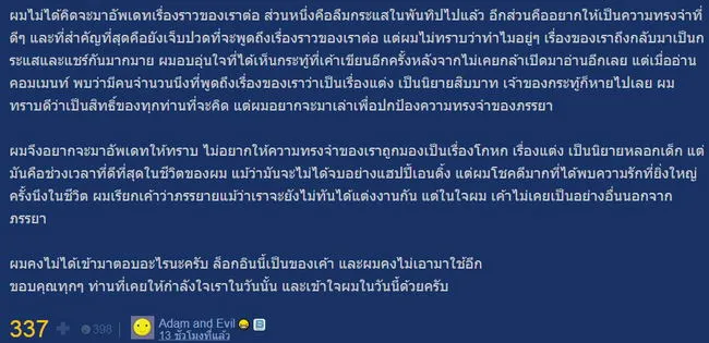 ผมจึงอยากจะมาอัพเดทให้ทราบ ไม่อยากให้ความทรงจำของเราถูกมองเป็นเรื่องโกหก เรื่องแต่ง เป็นนิยายหลอกเด็ก แต่มันคือช่วงเวลาที่ดีที่สุดในชีวิตของผม แม้ว่ามันจะไม่ได้จบอย่างแฮปปี้เอนดิ้ง แต่ผมโชคดีมากที่ได้พบความรักที่ยิ่งใหญ่ครั้งนึงในชีวิต ผมเรียกเค้าว่าภรรยายแม้ว่าเราจะยังไม่ทันได้แต่งงานกัน แต่ในใจผม เค้าไม่เคยเป็นอย่างอื่นนอกจากภรรยา
