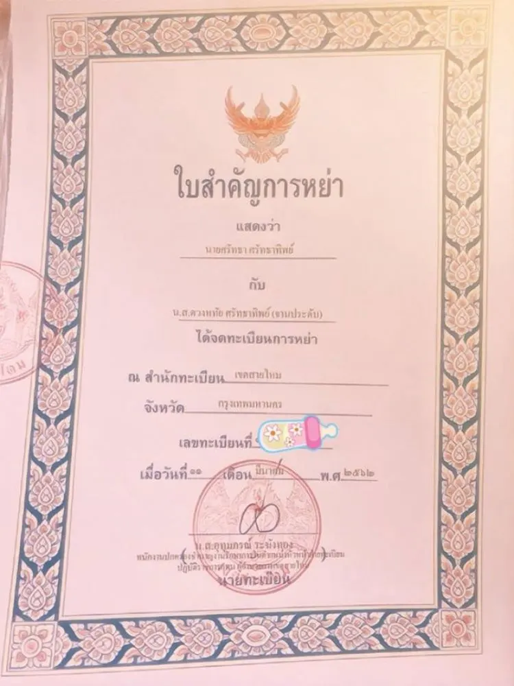 ด้านอดีตภรรยา โพสต์ข้อความว่า วันนี้เราทั้งคู่จบความสัมพันธ์ทางกฎหมายเรียบร้อยแล้ว อยากบอกว่ามันไม่ได้เป็นความผิดของใครคนใดคนนึง หรือมีมือที่สามอะไร แต่เป็นเรื่องของมุมมอง ทัศนคติ การใช้ชีวิต ของเราทั้งคู่ที่ไม่ตรงกัน เราได้เคลียร์ความสัมพันธ์กันมา6เดือนก่อนจะหย่ากันตามกฎหมาย และวันนี้เราทั้งคู่ได้จบความสัมพันธ์กับคนเก่าและเริ่มต้นความสัมพันธ์กับคนใหม่แล้วทั้งคู่ ต่างคนต่างใช้ชีวิตกันต่อและยังคงทำหน้าที่เป็นพ่อและแม่ที่ดีให้กับเฮฮาต่อไป ขอบคุณพี่แอ๊นท์ Thipdhida Satdhathip พี่เล็ก ที่คอยให้คำปรึกษาแนะนำในทุกๆเรื่อง รักและเอ็นดู ยอมรับในทุกๆการตัดสินใจ และมันจะเป็นแบบนี้ตลอดไป ขอบคุณมากๆแบบมากๆจริงๆพี่รัก Rug Satdhathip ถึงวันนี้ความสัมพันธ์เราจะเปลี่ยนไปแต่พี่รักก็ยังเป็นคนดีที่ตู่เคารพ ขอบคุณและขอโทษในทุกๆอย่างที่ผ่านมา ขอให้พี่เจอคนที่ดีที่พร้อมจะดูแลพี่อีกครั้งจากใจ