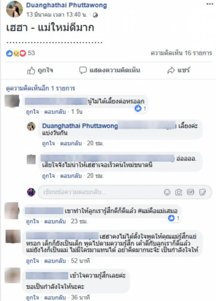 แถมล่าสุด ตู่ ยังโพสต์ข้อความด้วยว่า “เฮฮา – แม่ใหม่ดีมาก …………………………..” โดยมีคนเข้ามาให้กำลังใจว่า เข้าใจความรู้สึกเลย พร้อมบอกว่า เฮฮาคงไม่ได้ตั้งใจพูดให้คุณแม่รู้สึกแย่หรอก เด็กก็ยังเป็นเด็ก พูดไปตามความรู้สึก เค้าดีกับลูกเราก็ดีแล้ว แม่ยังไงก็เป็นแม่ ไม่มีใครมาแทนได้ อย่าคิดมากนะจ๊ะ เป็นกำลังใจให้