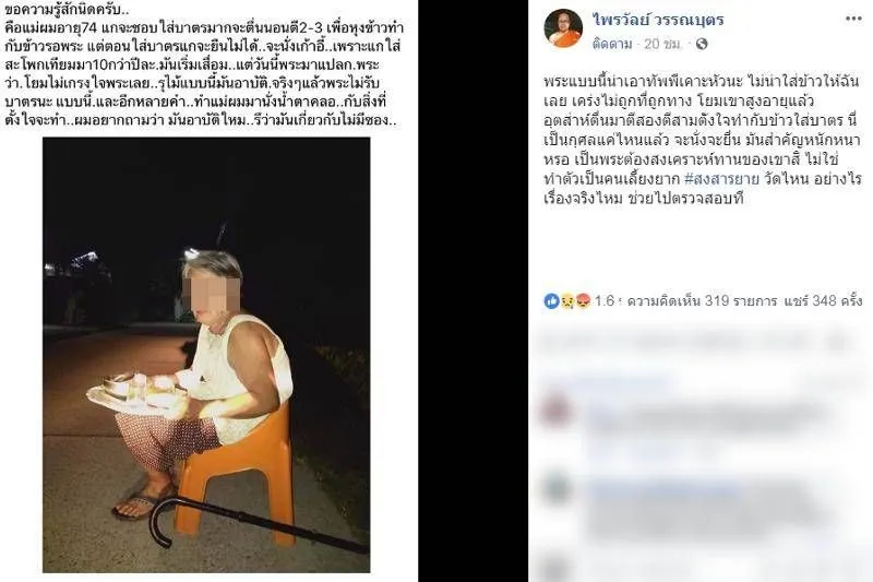 "พระแบบนี้น่าเอาทัพพีเคาะหัวนะ ไม่น่าใส่ข้าวให้ฉันเลย เคร่งไม่ถูกที่ถูกทาง โยมเขาสูงอายุแล้ว อุตส่าห์ตื่นมาตีสองตีสามตั้งใจทำกับข้าวใส่บาตร นี่เป็นกุศลแค่ไหนแล้ว จะนั่งจะยื่น มันสำคัญหนักหนาหรอ เป็นพระต้องสงเคราะห์ทานของเขาสิ ไม่ใช่ทำตัวเป็นคนเลี้ยงยาก #สงสารยาย วัดไหน อย่างไร เรื่องจริงไหม ช่วยไปตรวจสอบที"...