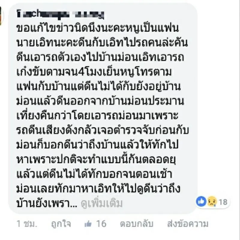 แฟนสาวของเอิร์ท - ขอแก้ไขข่าวนิดนึงนะคะหนูเป็นแฟนนายเอิทนะคะดีนกับเอิทไปรถคนล่ะคันดีนเอารถตัวเองไปบ้านม่อนเอิทเอารถเก๋งขับตามจน4โมงเย็นหนูโทรตามแฟนกับบ้านแต่ดีนไม่ได้กับยังอยู่บ้านม่อนแล้วดีนออกจากบ้านม่อนประมานเที่ยงคืนกว่าโดยเอารถม่อนมาเพราะรถดีนเสียงดังกลัวเจอตำรวจจับก่อนกับม่อนก็บอกดีนว่าถึงบ้านแล้วให้ทักไปหาเพราะปกติจะทำแบบนี้กันตลอดยุแล้วแต่ดีนไม่ได้ทักบอกจนตอนเช้าม่อนเลยทักมาหาเอิทให้ไปดูดีนว่าถึงบ้านยังเพราะบ้านยุใกล้ดีนแต่ไปหาก็ไม่เจอก็เลยมีเรื่องอย่างนี้แหละค่ะ