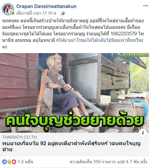 ออฟฟี่ ดาราดังที่ได้โพสต์ข้อความ ที่แชร์มาจากเว็บข่าวของ thairath ที่มีเนื้อความว่า คุณยายตาฝ้าฟางวัย 92 ปี ชาวจังหวัดสุรินทร์ อยู่ตามลำพังคนเดียวในกระท่อมที่บ้านหนองโบสถ์ ตำบลทุ่งมน บ้านที่อยู่ก็รู้สึกตัวผุที่พักผ่อนก็พังทลายจนกระทั่งเกือบจะนอนมิได้ ไม่มีห้องสุขาไว้ถ่าย วอนคนใจบุญสุนทานช่วยซ่อมแซมบ้าน…