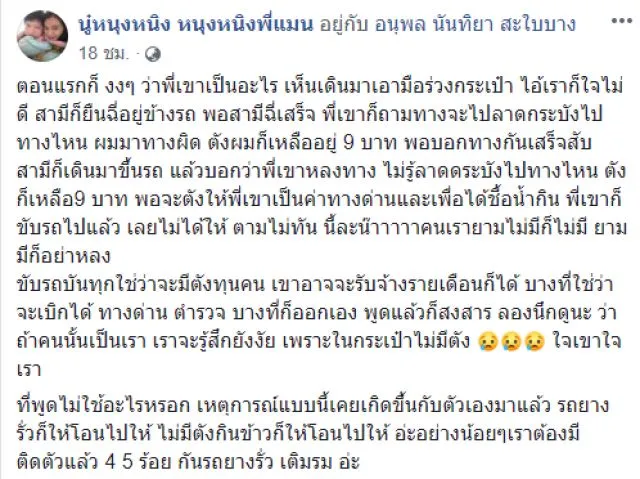 "ตอนแรกก็งงๆ ว่าพี่เขาเป็นอะไร เห็นเดินมาเอามือล้วงกระเป๋า ไอ้เราก็ใจไม่ดี สามีก็ยืนฉี่อยู่ข้างรถ พอสามีฉี่เสร็จ พี่เขาก็ถามทางจะไปลาดกระบังไปทางไหน ผมมาทางผิด ตังค์ผมก็เหลืออยู่ 9 บาท พอบอกทางกันเสร็จสับ สามีก็เดินมาขึ้นรถ แล้วบอกว่าพี่เขาหลงทาง ไม่รู้ลาดดระบังไปทางไหน ตังค์ก็เหลือ9 บาท พอจะตังค์ให้พี่เขาเป็นค่าผ่านด่านและเพื่อได้ชื้อน้ำกิน พี่เขาก็ขับรถไปแล้ว เลยไม่ได้ให้ ตามไม่ทัน นี่ละนะคนเรายามไม่มีก็ไม่มี ยามมีก็อย่าหลง ขับรถบรรทุกทุกใช่ว่าจะมีตังค์ทุกคน เขาอาจจะรับจ้างรายเดือนก็ได้ บางที่ใช่ว่าจะเบิกได้ ทางด่านตำรวจ บางทีก็ออกเอง พูดแล้วก็สงสาร ลองนึกดูนะ ว่าถ้าคนนั้นเป็นเรา เราจะรู้สึกยังไง เพราะในกระเป๋าไม่มีตัง ใจเขาใจเรา ที่พูดไม่ใช่อะไรหรอก เหตุการณ์แบบนี้เคยเกิดขึ้นกับตัวเองมาแล้ว รถยางรั่วก็ให้โอนไปให้ ไม่มีตังค์กินข้าวก็ให้โอนไปให้ อย่างน้อยๆ เราต้องมีติดตัวแล้ว 400-500 กันรถยางรั่ว เติมลม"