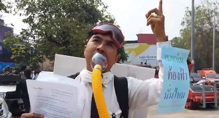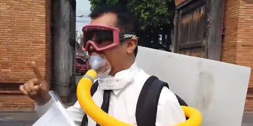 ที่ข่วงประตูท่าแพ กลางเมืองเชียงใหม่ ขณะที่ผู้ว่าและหัวหน้าหน่วยงานราชการกำลังทำพิธีเปิดกิจกรรมประธาน เปิดยุทธการสยบไฟป่าและแก้ปัญหาหมอกควัน มีนายธีระพล ขุนหมื่นลายประดิษฐ์ เป็นนักศึกษาวิชาท่องเที่ยวจากมหาวิทยาลัยแห่งหนนึ่ง สวมชุดกรองอากาศ ที่ประดิษฐ์ด้วยตัวเองทั้งหน้ากาก และท่อกรองอากาศครอบปากและจมูก