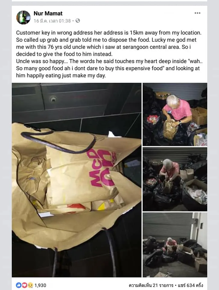 อย่างเช่นเรื่องราวของพนักงานคนหนึ่งร้าน GrabFood ที่ประเทศสิงคโปร์ เมื่อวันที่ 16 มีนาคม ที่ผ่านมา หลังจากที่ลูกค้าใส่ข้อมูลที่อยู่ผิดพลาด ซึ่งอยู่ห่างออกไปจากตำแหน่งของเขาไกลถึง 15 กิโลเมตร เขาจึงโทรเข้าศูนย์ Grab และทางบริษัทแนะนำให้เขาทิ้งอาหารเหล่านั้นไป และในขณะเดียวกันพนักงานคนดังกล่าวได้พบกับคุณตาวัย 76 ปี ท่าทางหิวโซ ในย่าน Serangoon Central เขาจึงนำอาหารให้คุณตาได้รับประทาน แทนที่จะนำอาหารเหล่านี้ไปทิ้ง