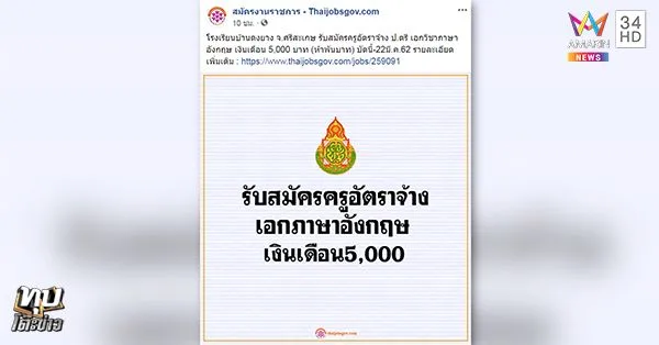 9 มี.ค. 62 ที่ผ่านมาจากกรณีเพจรับสมัครงานราชการ ลงข้อมูลประกาศรับสมัครคัดเลือกบุคคลเพื่อจ้างเป็นลูกจ้างชั่วคราว 1 อัตรา ในตำแหน่งครูผู้สอนภาษาอังกฤษ คุณสมบัติการศึกษาปริญญาตรี เอกวิชาภาษาอังกฤษ เงินเดือน 5,000 บาท โดยเอกสารดังกล่าวระบุการจ้างงานเป็นแบบอัตราจ้าง ทำงานเต็มเวลาจันทร์ – ศุกร์ สำหรับผู้ที่สนใจ สามารถสมัครได้ที่โรงเรียนบ้านดงยาง จ.ศรีสะเกษ ตั้งแต่วันที่ 18 – 22 มี.ค. 62