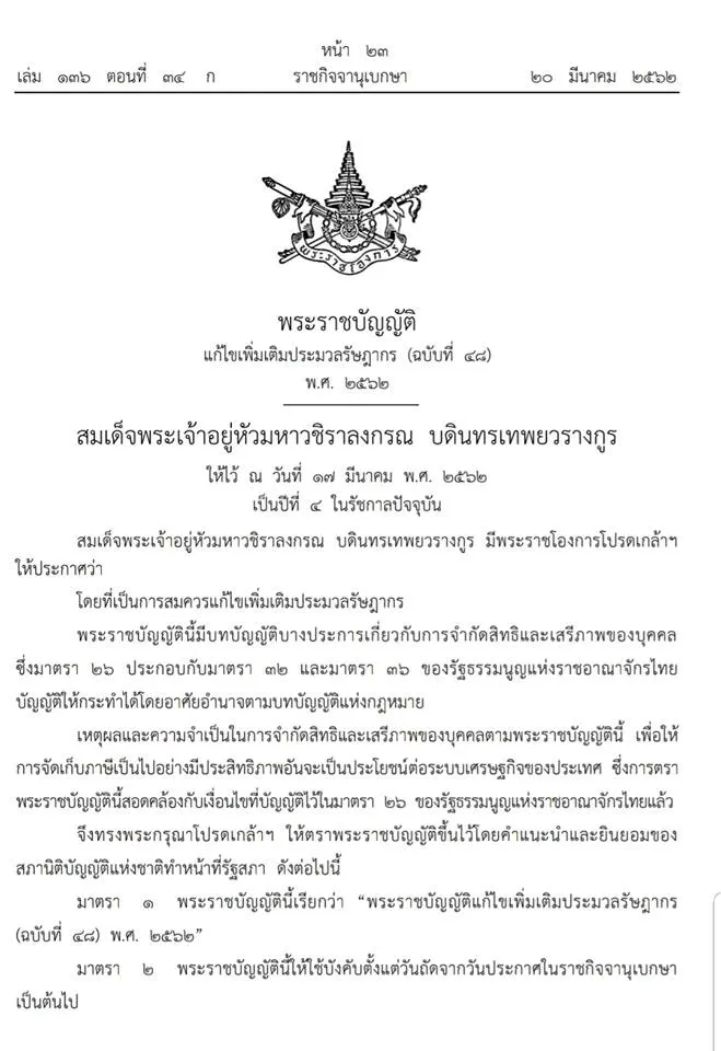 20 มีนาคม 2562- เว็บไซต์ราชกิจจานุเบกษาประกาศเผยแพร่ พระราชบัญญัติแก้ไขเพิ่มเติมประมวลรัษฎากร (ฉบับที่ 48) พ.ศ. 2562 มีผลบังคับใช้ 21 มี.ค. 2562 เพื่อเป็นไปตามแผนยุทธศาสตร์การพัฒนาโครงสร้างพื้นฐานระบบการชำระเงินแบบอิเล็กทรอนิกส์แห่งชาติ ให้ใช้ธุรกรรมทางอิเล็กทรอนิกส์มาอำนวยความสะดวกแก่ประชาชน ซึ่งรวมถึงการชำระภาษี ทั้งนี้ผลจากการบังคับใช้ จะทำให้ร้านขายของออนไลน์
