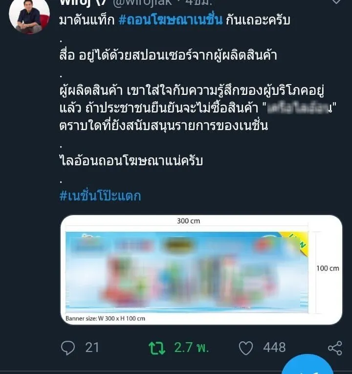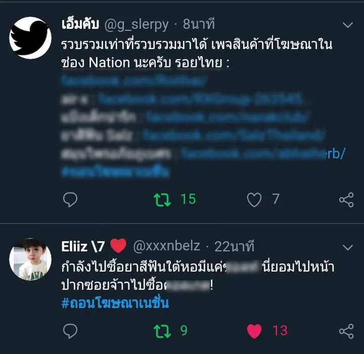 แฮชแท็กเดือด #ถอนโฆษณาเนชั่น คนในทวิตเตอร์กำลังมีการรณรงค์ให้ บอยคอท สปอนเซอร์ของเนชั่นทั้งหมด เหตุ จากข่าวที่ตัดต่อเสียง