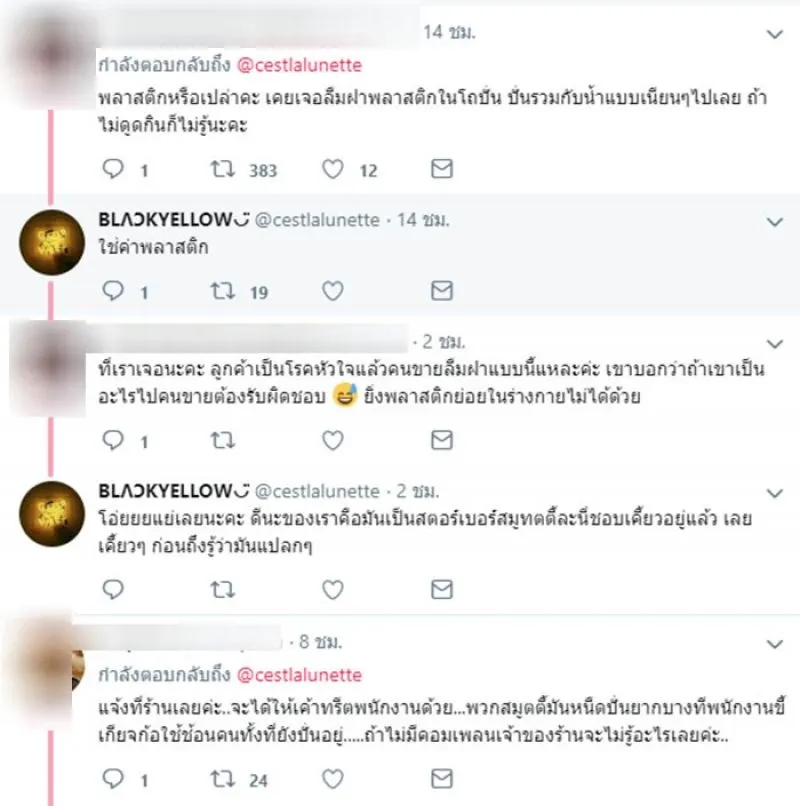 เมื่อวันที่ 20 มีนาคม 2562 ผู้ใช้ทวิตเตอร์คุณcestlalunette ได้เผยภาพน้ำปั่นสตอเบอรี่สมูทตี้ ที่เทลงในที่กรอง พบเศษพลาสติกเป็นชิ้นเล็ก ซึ่งผู้โพสต์กล่าวว่า ในตอนแรกที่เคี้ยวนึกว่าเป็น "เม็ดสตอเบอรี่" ทว่าหลังจากดูดน้ำปั่นรอบ 2 เจออีกครั้ง ถึงเทน้ำทิ้งใส่ที่กรอง แล้วล้างน้ำเปล่า จึงเห็นเป็นเศษพลาสติกใสๆ ชิ้นเล็กๆ จำนวนมาก