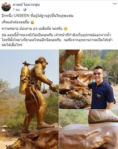 และล่าสุดเมื่อวันที่ 21 มี.ค.62 ทางเฟซบุ๊ก”หมอภาคย์” ได้โพสต์ภาพรูปปั้น จ่าแซม พร้อมระบุข้อความว่า อีกหนึ่ง UNSEEN ที่อยู่ใต้ฐานรูปปั้นวีรบุรุษแซมเห็นแล้วต้องอมยิ้ม 😆ความหมาย ต้องถาม อจ.เฉลิมชัย นะครับ 😁ปล.ตอนนี้ถ้ำหลวงยังไม่เปิดนะครับ เจ้าหน้าที่กำลังเก็บอุปกรณ์ออกจากถ้ำใครที่ตั้งใจมาเที่ยวอดใจรออีกนิดนะครับ…รอฟังจากอุทยานว่าจะเปิดให้เข้าชมได้เมื่อไหร่