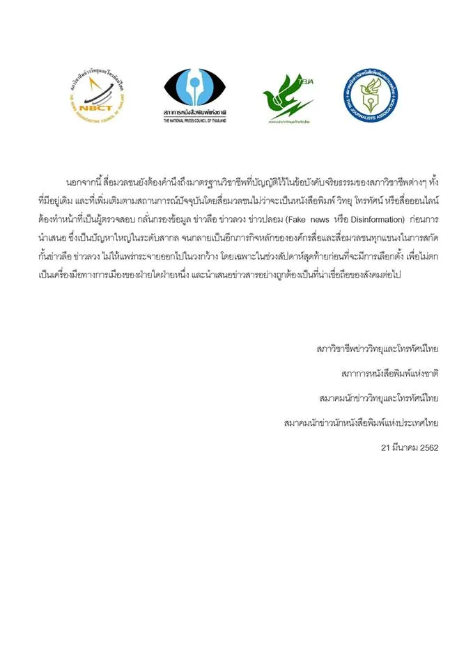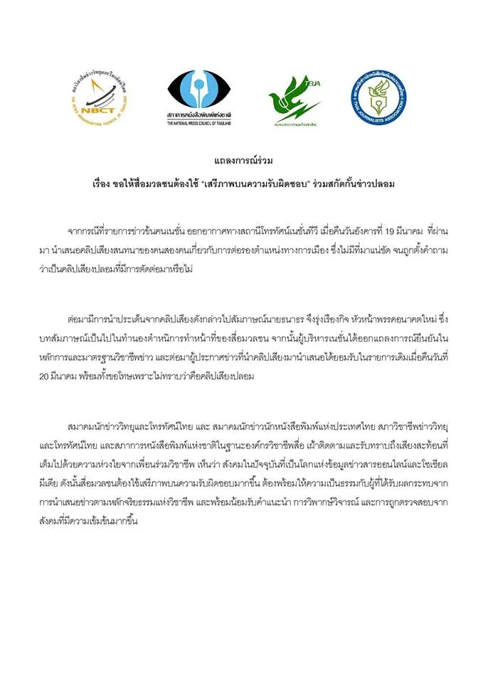 แถลงการณ์ร่วม เรื่อง ขอให้สื่อมวลชนต้องใช้ “เสรีภาพบนความรับผิดชอบ” ร่วมสกัดกั้นข่าวปลอม