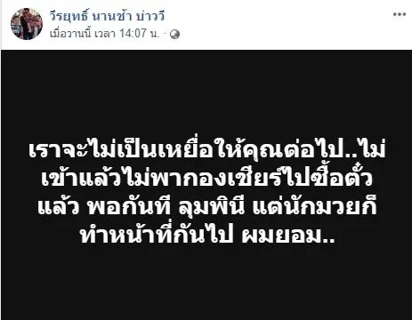 ไปอ่านคอมเม้นต์ไปดูกระแสแฟนมวยบ้างนะครับ อย่าดูถูกคนดูมวยที่เขาไม่เล่นการพนัน เขาดูมวยเป็น ทุกเพจทุกเฟส ให้วรวุฒิชนะหรืออย่างมากแค่เสมอ มวยถ่ายทอดสดคนดูทั่วโลก ทำกันยังงี้ วงการมวยมีแต่เสื่อมลง สำหรับผมอาจขอทบทวนตัวเองและปรึกษาทีมงานค่ายอาจยุติการทำมวยด้วยใจรัก แต่ก็อดสงสารน้องๆทีมงานและวรวุฒิ ที่เราดูแลมาจาก 25000 จนถึง 100000 กว่า ผมท้อครับเจอแบบนี้ เข้ามาเพื่อช่วยส่งเสริมคิดว่าอย่างน้อยคำว่าบ่าววีได้ช่วยดึงแฟนคลับแฟนเพลงมาหันสนใจมวยบ้าง