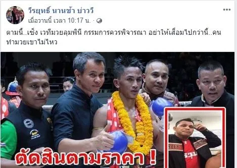 บ่าววี ศิลปินนักร้องเพื่อชีวิตชื่อดังจากแดนใต้ ไม่ยอมรับคำตัดสินของเปาวิกลุมพินี ประกาศตัวเองไม่เข้าสนามฯ รวมถึงกลุ่มแฟนคลับ ชี้ รับไม่ได้กับการตัดสินศิษย์รักแพ้น่ากังขา กรรมการไม่ยุติธรรม ตัดสินตามราคาบ่าววี นักร้องชื่อดัง ผู้สนับสนุน วรวุฒิ บ่าววียีนส์ นักมวยไทยชื่อดัง โพสต์แสดงความคิดเห็น ถึงกรณีมวยคู่เอก ระหว่าง วรวุฒิ พบกับ ก้องศึก ศิษย์สารวัตรเสือ ในการชกป้องกันแชมป์ เวทีลุมพินี “ศึกลุมพินีแชมป์เปี้ยนเกริกไกร” ซึ่งผลการแข่งขันปรากฎว่า ก้องศึก เอาชนะคะแนนไปได้อย่างคาใจ