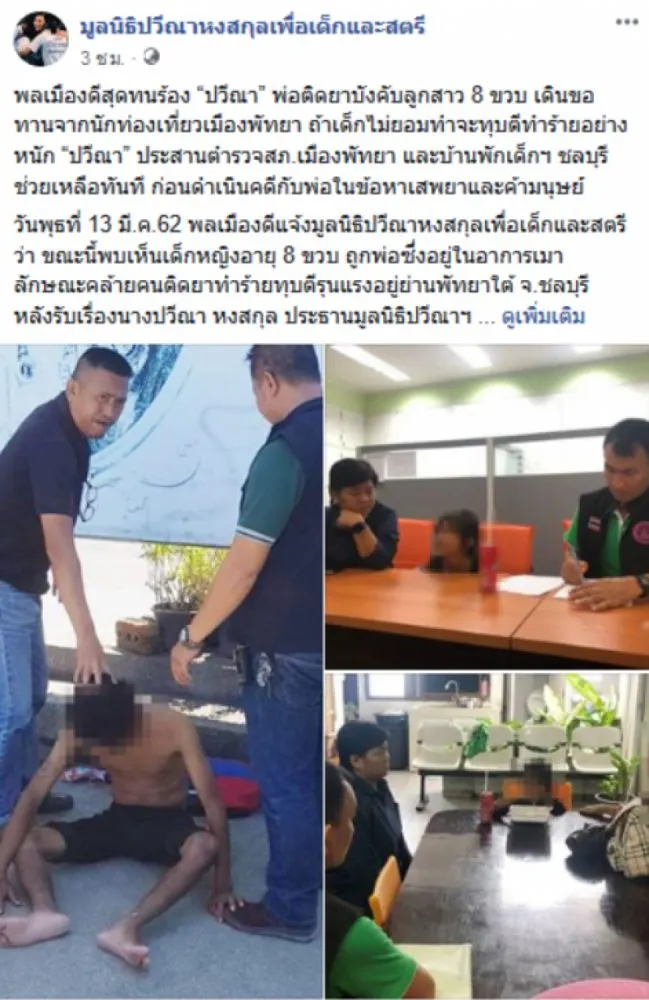 วันพุธที่ 13 มี.ค.62 พลเมืองดีแจ้งมูลนิธิปวีณาหงสกุลเพื่อเด็กและสตรีว่า ขณะนี้พบเห็นเด็กหญิงอายุ 8 ขวบ ถูกพ่อซึ่งอยู่ในอาการเมาลักษณะคล้ายคนติดยาทำร้ายทุบตีรุนแรงอยู่ย่านพัทยาใต้ จ.ชลบุรี หลังรับเรื่องนางปวีณา หงสกุล ประธานมูลนิธิปวีณาฯ ได้ประสาน พ.ต.อ.อภิชัย กรอบเพชร สภ.เมืองพัทยา และนางสาวพาณี จันทร์ปรุงตน หัวหน้าบ้านพักเด็กและครอบครัวจังหวัดชลบุรี ส่งเจ้าหน้าที่ตำรวจและเจ้าหน้าที่บ้านพักเด็กและครอบครัวจังหวัดชลบุรีลงพื้นที่ตรวจสอบทันที โดยพบเด็กหญิงดังกล่าวนั่งร้องไห้อยู่ริมชายหาดและเล่าให้เจ้าหน้าที่ตำรวจฟังว่า ถูกพ่อบังคับให้เดินขอทานจากนักท่องเที่ยวต่างชาติและคนไทยที่มาเที่ยวตามชายหาด ห้างสรรพสินค้าและย่านชุมชน หลังจากได้เงินมาพ่อก็จะเอาเงินทั้งหมดไปซื้อเหล้ากิน ซื้อยาเสพติดมาเสพ แต่ตนไม่อยากเดินขอทานจึงถูกพ่อตีเป็นประจำ