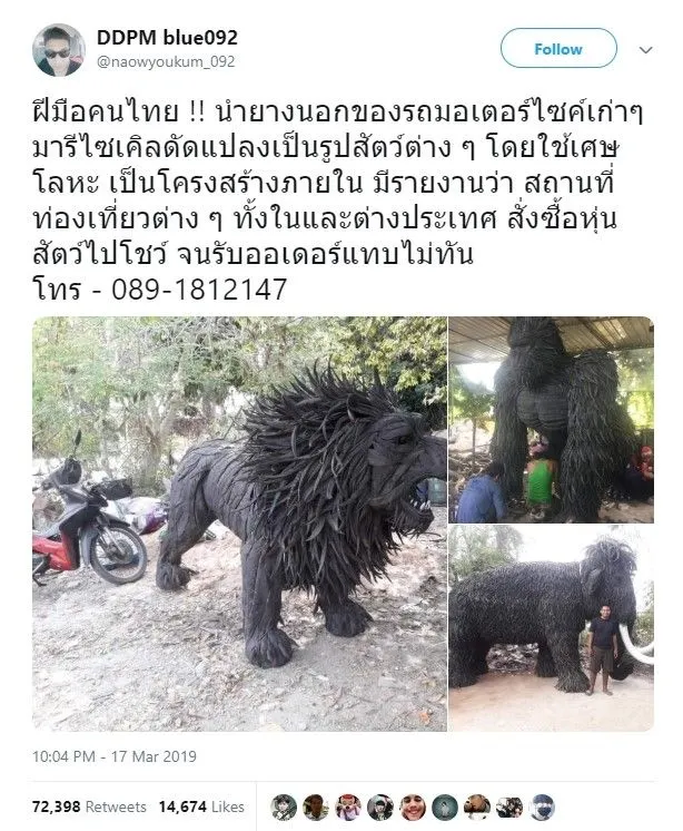 มีผู้ใช้ ทวิตเตอร์ DDPM blue092 โพสต์รูปภาพและข้อมูลเกี่ยวกับสิ่งประดิษฐ์จากยางรถยนต์ และรถจักรยานยนต์เป็นรูปสัตว์ต่างๆ ที่มีความสวยงามและแปลกตา สร้างความฮือฮาแก่ชาวเน็ตที่เข้ามาชม พร้อมชื่นชมในแนวคิดการนำสิ่งของที่ใช้แล้วกลับมาสร้างมูลค่าใหม่อีกครั้ง