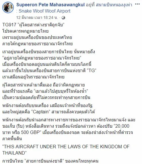 "TG917 “ผู้โดยสารต่างชาติถูกจับ” โปรดเคารพกฏหมายไทย เพราะอยู่บนเครื่องบินของประเทศไทย ภายใต้กฎหมายของราชอาณาจักรไทย เราอยู่บนเครื่องบินของสายการบินไทย นั่นหมายถึง “อยู่ภายใต้กฏหมายของราชอาณาจักรไทย” เมื่อเครื่องบินจอดอยู่บนแผ่นดินใดก็ตามบนโลกนี้ แล้วเราขึ้นไปบนเครื่องบินสายการบินแห่งชาติ “TG” เราเสมือนอยู่ในราชอาณาจักรไทย