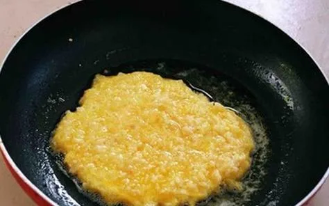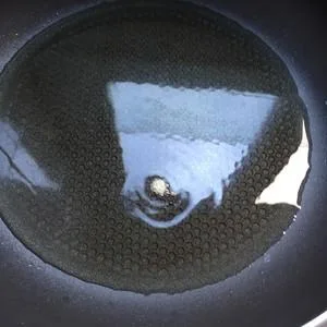 5.ตั้งกระทะบนเตา เปิดไฟเล็กที่สุด เทน้ำมันลงไปในกระทะพอประมาณ รอจนน้ำมันเดือดประมาณ 60% ทดสอบด้วยการนำข้าวลงไปในกระทะเล็กน้อย
