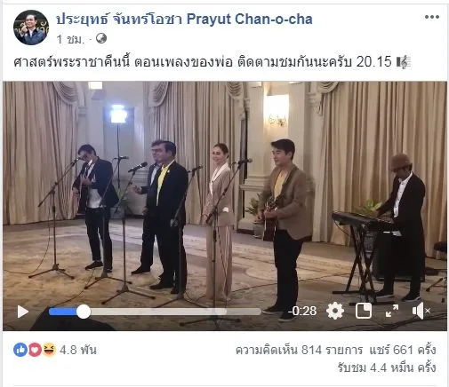 22 มี.ค.62 เรียกได้ว่า ในโวเชียลกำลังมีกระแสแห่แชร์คลิป ขณะ พล.อ.ประยุทธ์ จันทร์โอชา นายกรัฐมนตรี และหัวหน้าคสช. ซ้อมร้องเพลงกับวงดนตรีชื่อดัง อย่างนูโว พร้อมด้วนดาราสาวมากความสามารถอย่าง นัท มีเรีย ซึ่งทางเพจ ประยุทธ์ จันทร์โอชา Prayut Chan-o-cha ได้นำคลิปดังกล่าวมันโพสต์เอาไว้ โดยระบุว่า